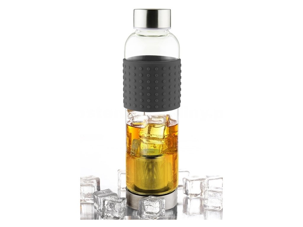 Skleněná trendy láhev s nerezovým infuserem pro přípravu ledového čaje nebo ledové kávy.