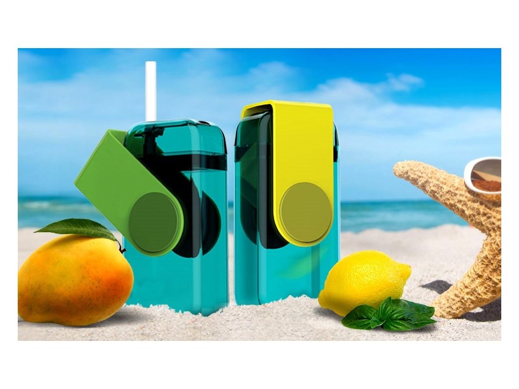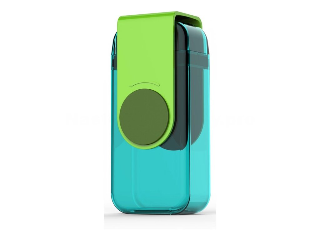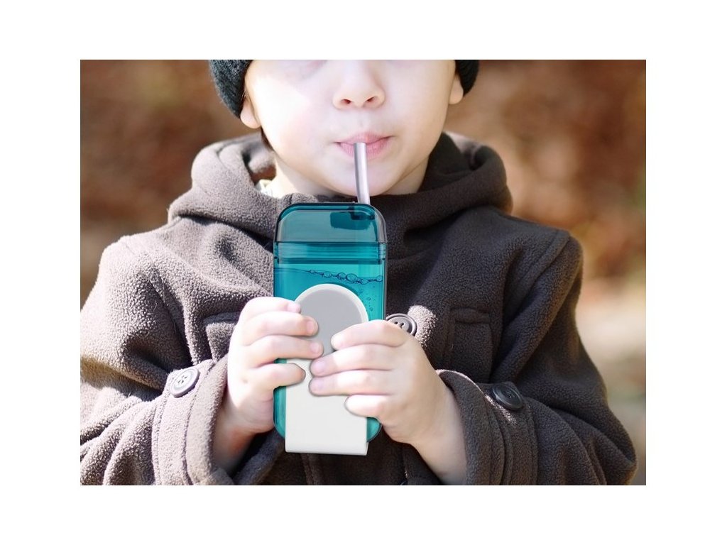Barevná "spona" se překlopí přes pružný nástavec na pevném brčku a tím se box uzavře, aby se nápoj nestal součástí aktovky, batohu, kapsy, kabelky...
