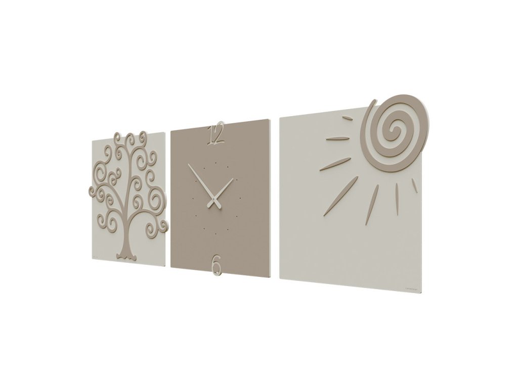 Tři panely s motivem stromu života, hodinového ciferníku a stylizovaného slunce vytváří kompozici dlouhou 190 cm, která se stane výraznou dekorací interiéru.