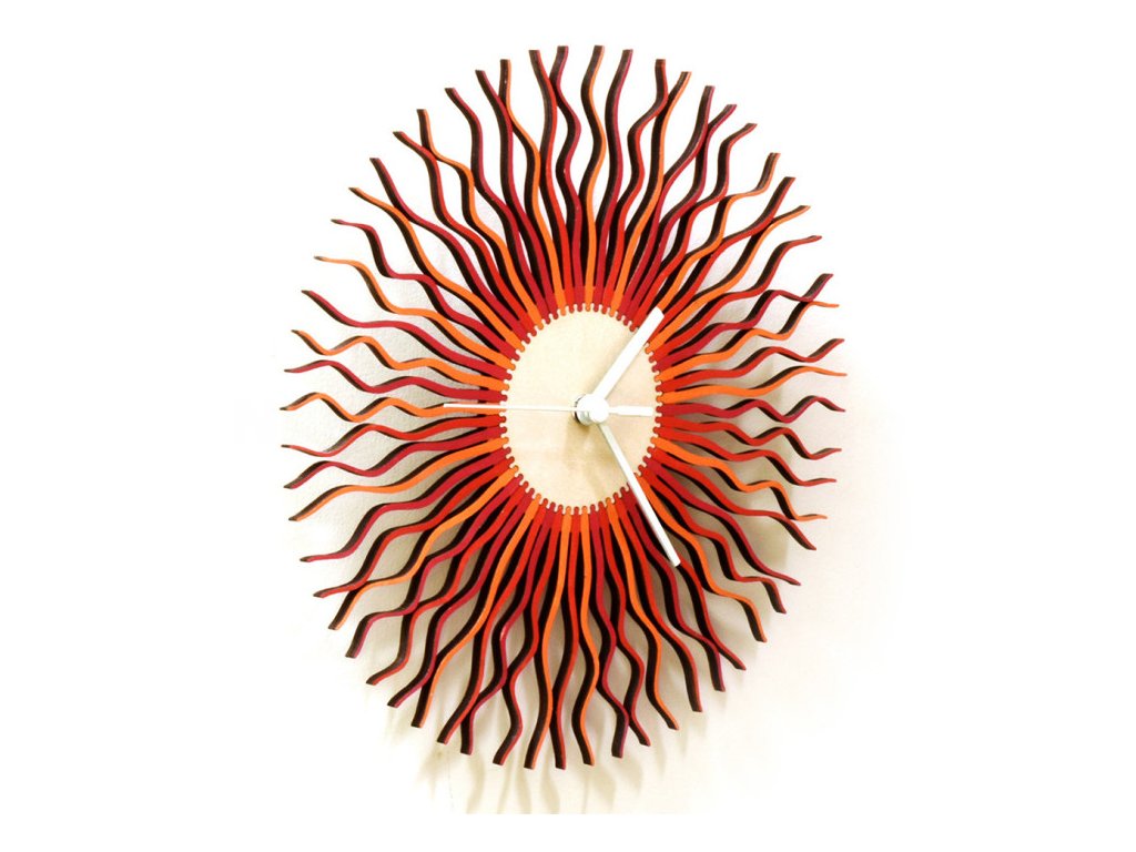 Ciferník je vyroben z březové překližky o tloušťce 6 mm. Paprsky jsou laserem vyřezány, ručně broušeny a ručně malovány ve třech odstínech červené a oranžové. Povrch je ošetřen olejem, který zvýrazňuje kresbu dřeva.