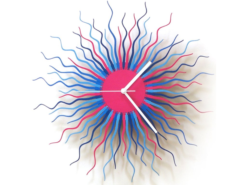 Ciferník a paprsky jsou vyrobeny z březové překližky o síle 6 mm. Paprsky jsou laserově vyřezané, ručně broušené a malované v kombinaci růžové a tří odstínů modré. Poté jsou pečlivě upevněny na středový disk. Díky ručnímu zpracování je každý kus originál.
