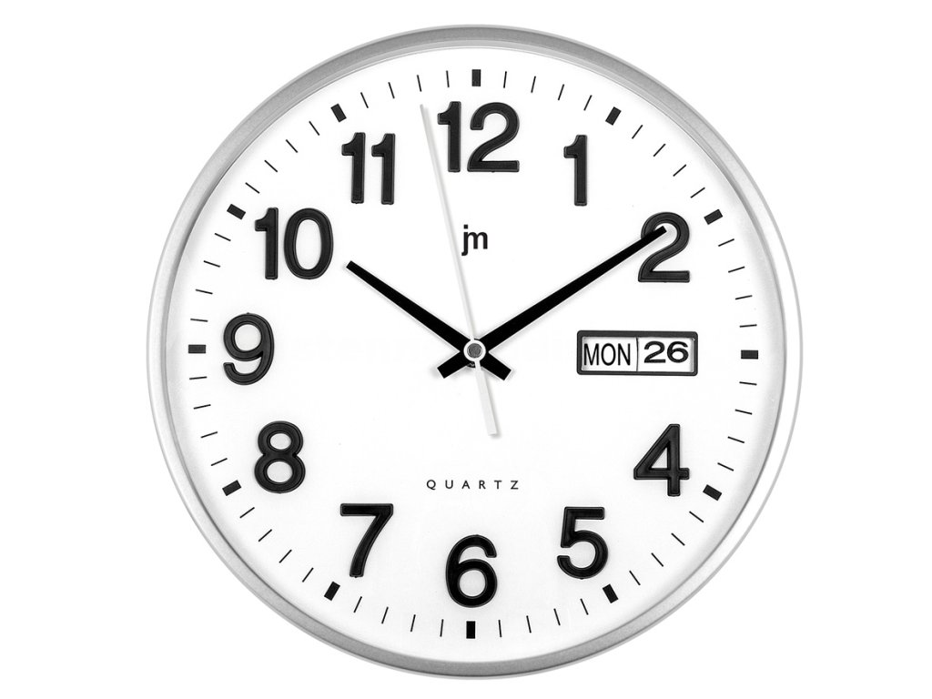 Nástěnné hodiny v kovovém rámku s datumem (označení dnů je v angličtině).