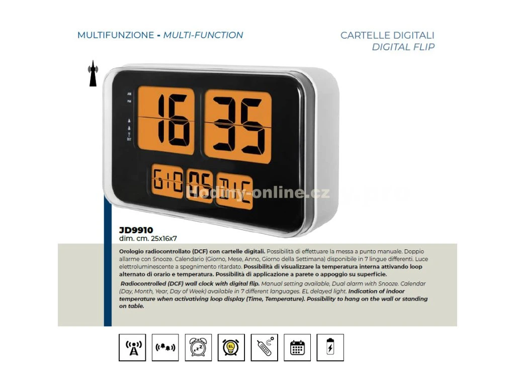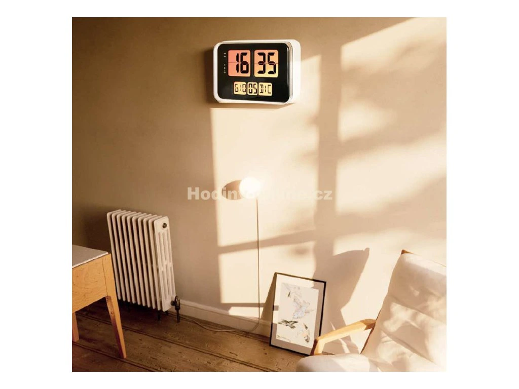 Hodiny mají funkci 2 budíku s odložením, vnitřní teploměr, kalendář (den, měsíc a rok)