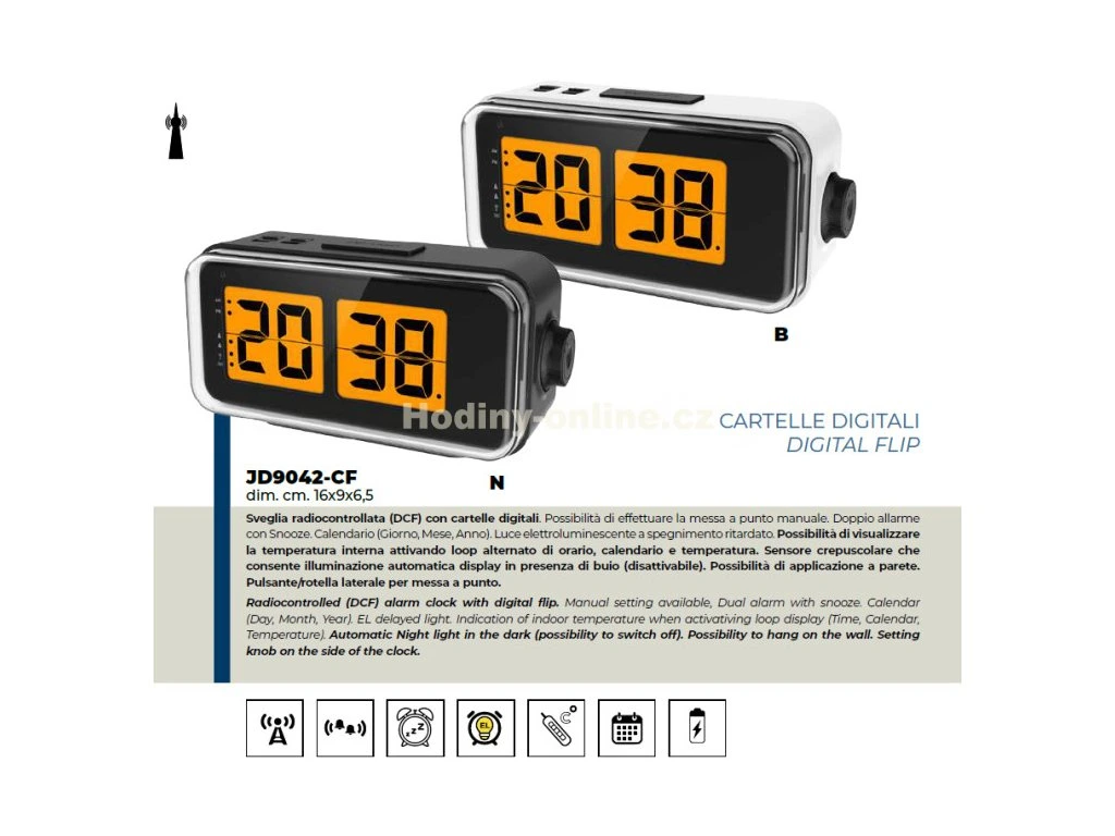 Hodiny mají funkci 2 budíku s odložením, vnitřní teploměr, kalendář (den, měsíc a rok)